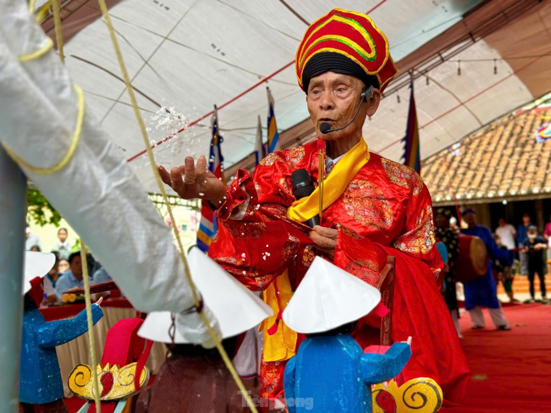 Thầy pháp thực hiện các nghi thức thế lính an vị các vong linh lính Hoàng Sa trước khi thả thuyền ra biển.
